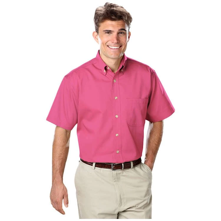 Send a chill down your customers’ spines wit this 6.5 oz. men’s short-sleeve colorfast twill shirt. This eye-catching piece of apparel is made from 100% cotton and is washed and preshrunk for extra comfort. It features a button-down collar, a double-back yoke, two side back pleats, a patch pocket, bone-horn buttons and hemmed sleeves. Classic fit, this trendy top comes in several colors and sizes, and it is bound to turn plenty of heads!