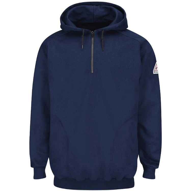 - Two ply hood with drawstring closure and 1/4 zip front
