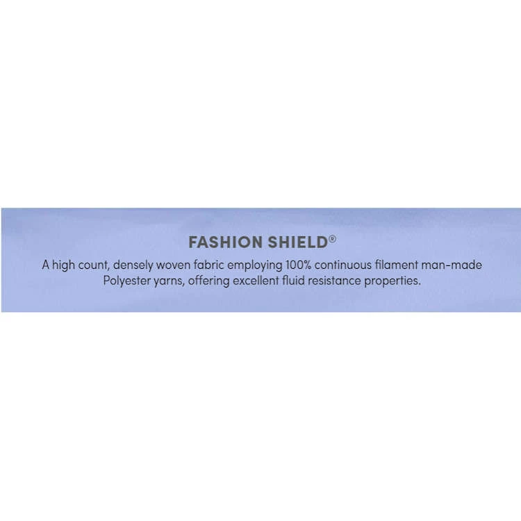 - Front and sleeves made of single-ply fluid-resistant barrier fabric of Fashion Shield® – a high count, densely woven fabric employing 100% continuous filament man-made polyester yarns, offering excellent fluid resistance properties