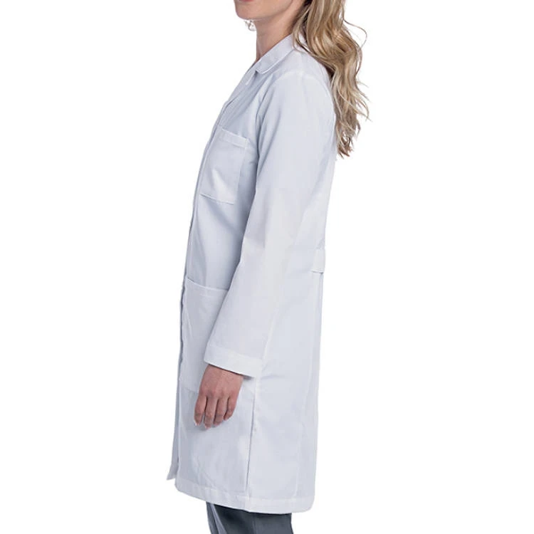 - This four-button lab coat features back belt accent, side hand access, three front pockets and two inside pockets