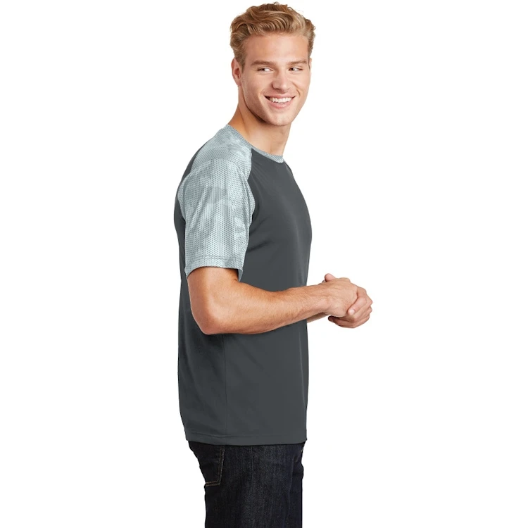 The sublimated digital CamoHex print on the sleeves, shoulders and collar give this moisture-wicking tee a bold, modern look.