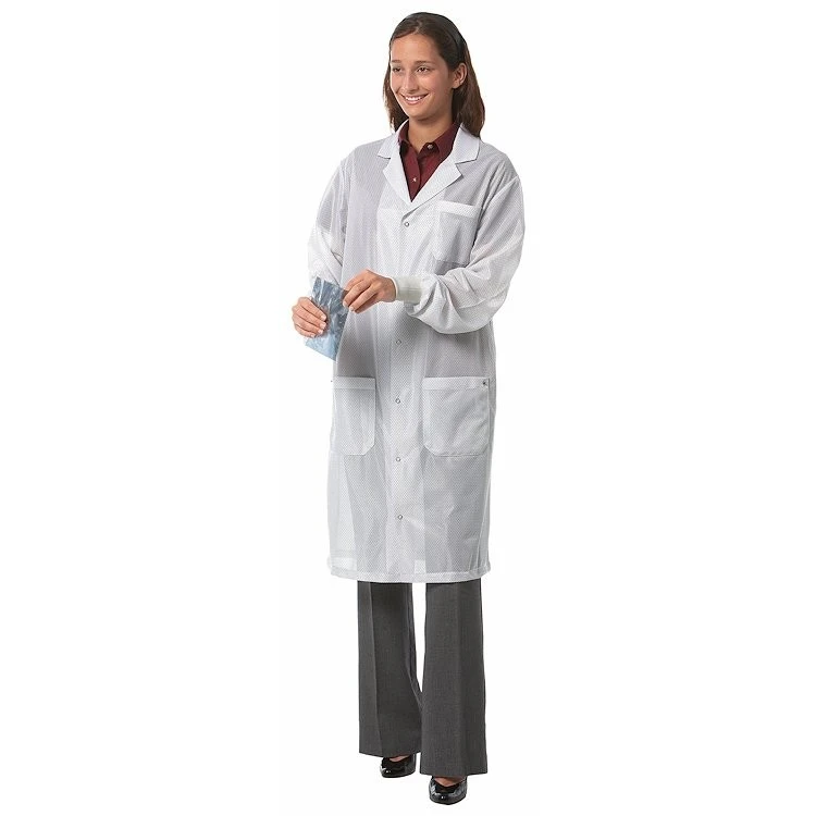 ESD lab wear is donned in microelectronic company’s assembly; repair, testing, packaging and other cleanroom peripheral areas where static control remains critical for the unimpairment of the product. Work-Stat System, 87% Polyester / 13% Carbon Suffused Nylon in a knitted zig-zag grid configuration.